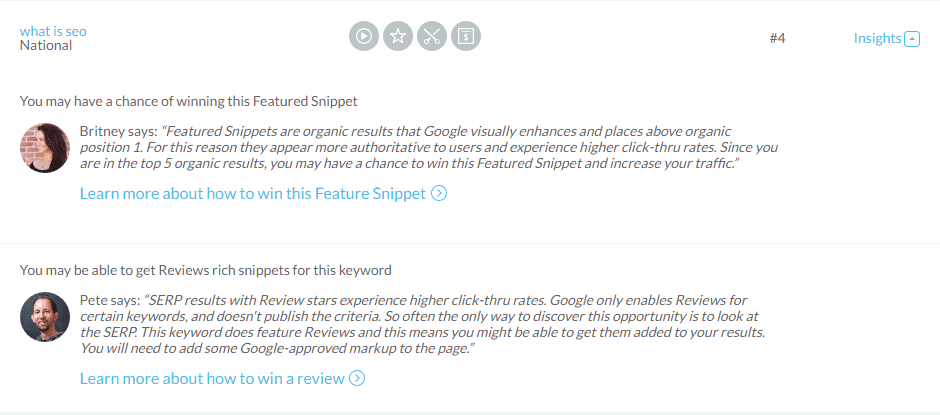 Click on any keyword with “Insights” to see possible opportunities. At launch, we highlight keywords with Featured Snippets, News Packs, Reviews, Videos, and Site Links (if you’re not currently listed in them). We hope to add more insights in the near future.